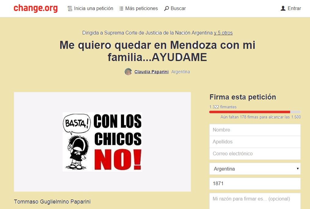 Además desde la ONG change.org están solicitando firmas para que el pequeño se quede en Mendoza junto a su mamá