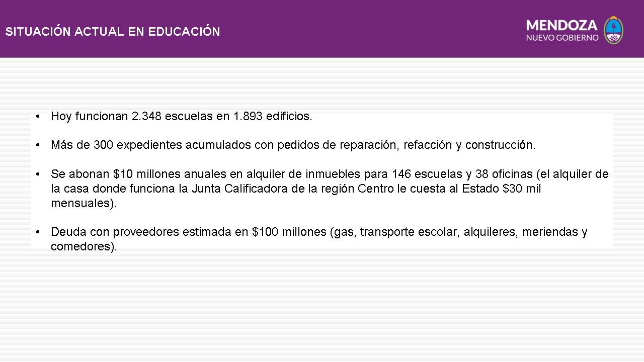 A su vez el gobierno se comprometió a solucionar las dificultades que deben enfrentar los docentes, especialmente en cuanto a la calidad edilicia del sistema. El Ejecutivo evaluó que de 1.893 edificios, 213 requieren arreglos estructurales urgentes; además de que se les deben más de 100 millones de deuda a los proveedores.