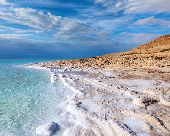 Es el punto más bajo de la Tierra, a casi 430 metros por debajo del nivel del mar, y disminuye un metro más cada año. Este lago salino entre Israel, Cisjordania y Jordania, es único, famoso por su alta salinidad.