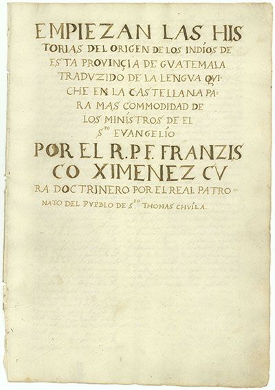 Hasta nosotros ha llegado gracias a la motivación del fraile Francisco Ximénez, misionero en el territorio quiché, donde tuvo buenas relaciones con los nativos y a los que no cesó de intentar comprender. La confianza ganada entre el pueblo le granjeó la excepcional oportunidad de conocer el texto, a cuyo estudio dedicó prácticamente su vida. Tal fue el interés del fraile por conocer el sustrato cultural y religioso de aquellos nativos quiché, que se empeñó en la transcripción a caracteres latinos de la obra, escrita en la lengua original, y a añadir traducciones en castellano al margen para facilitar su comprensión.