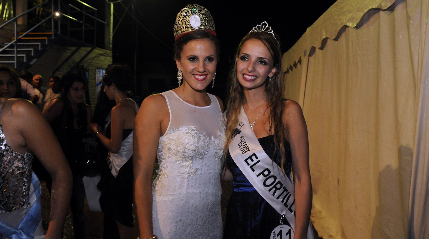 La reina saliente de Tunuyán, Antonella Lazzarini, y la nueva soberana departamental, María Macarena Muzaber, tras la tormenta y posando para las cámaras. La joven no pudo ser coronada.