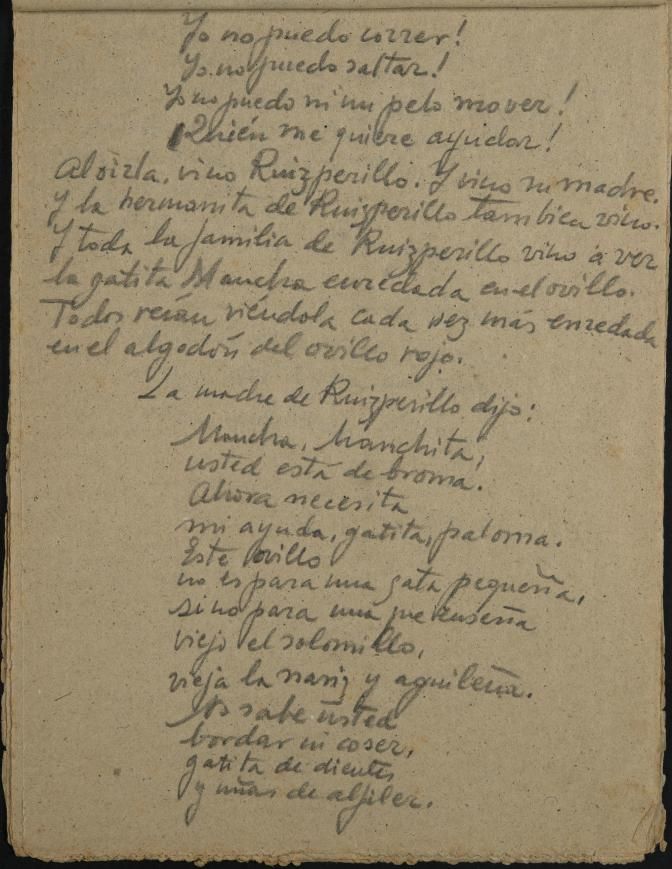 Los cuentos están escritos en un pequeño cuaderno creado con hojas de papel higiénico cosidas por la parte superior, con los bordes ya irregulares y envejecidos. Contiene cuatro relatos tiernos, y repletos de metáforas sobre la libertad, titulados ‘El potro oscuro’, ‘El conejillo’, ‘Un hogar en el árbol’ y ‘La gatita Mancha y el ovillo rojo’. Los dos últimos son inéditos.