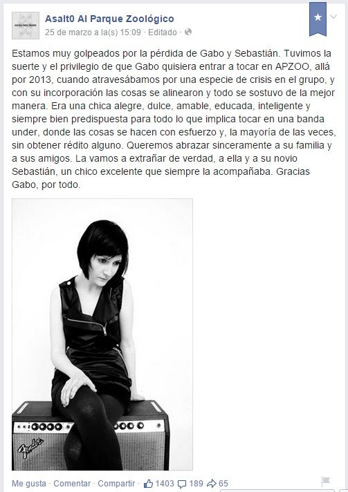 "Estamos muy golpeados por la pérdida de Gabo y Sebastián. Tuvimos la suerte y el privilegio de que Gabo quisiera entrar a tocar en APZOO, allá por 2013, cuando atravesábamos por una especie de crisis en el grupo, y con su incorporación las cosas se alinearon y todo se sostuvo de la mejor manera", dice el texto.