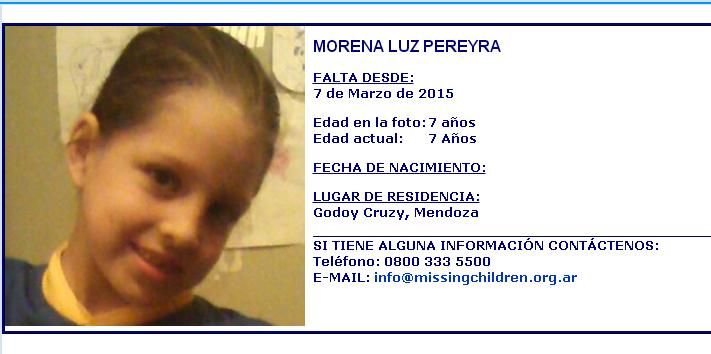 Ayer, pasadas las 19 horas, Morena Luz Pereyra Peralta desapareció del Barrio Gráfico de Godoy Cruz. La niña, que tiene 7 años, salió a comprar a un comercio que queda a unas tres cuadras de su casa y desde entonces no se sabe nada de ella.