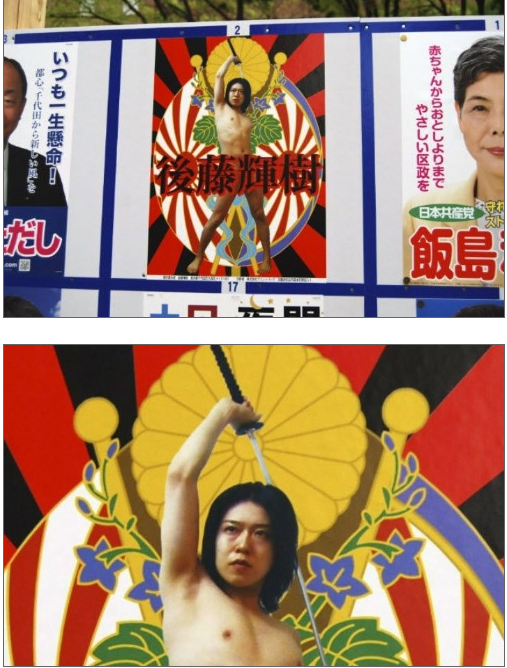 Los carteles de Goto, en los que se le ve sin ropa y blandiendo una katana con el blasón de la casa imperial japonesa de fondo y su nombre en caracteres japoneses cubriendo su zona genital, se convirtieron en una de las imágenes más compartidas en redes sociales desde que arrancó la campaña esta semana.