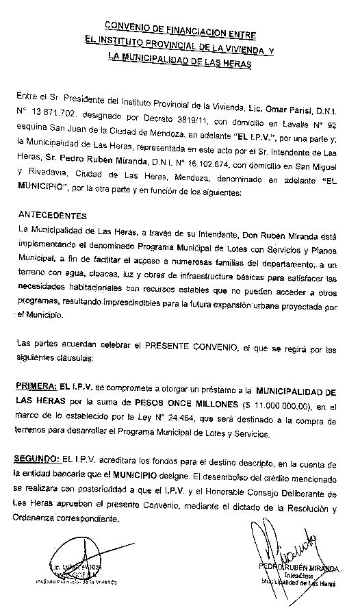 El Instituto Provincial de la Vivienda aprobó un crédito de 11 millones de pesos con el que la Municipalidad de Las Heras adquirirá algunos terrenos para ejecutar el programa de Lotes con Servicios.