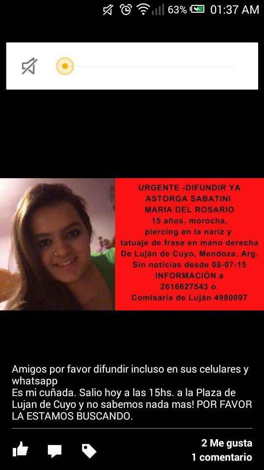 María del Rosario Astorga Sabatini, de 15 años de edad, morocha, con un piercing en la nariz y un tatuaje en la mano derecha, salió de su casa el miércoles 8 de julio, a las 15 horas, y alarmó a su familia con su desaparición.