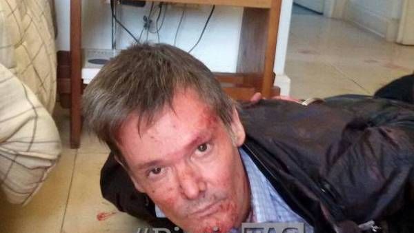 Esposado y en el piso se lo ve a Farré, además de con manchas de sangre en todo el cuerpo.
