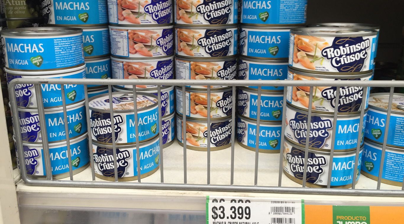 Todo el que viene aprovecha para comprar latitas y llevar a Mendoza. Revisamos las conservas de la marca "Robinson Crusoe", que es la más cara: las cholgas cuestan $1739; el atún $999, los choritos $1199 y el surtido de mariscos, $1699. Las machas, que son las más buscadas, cuestan $3399. Todas las latitas son las de 200 grs.