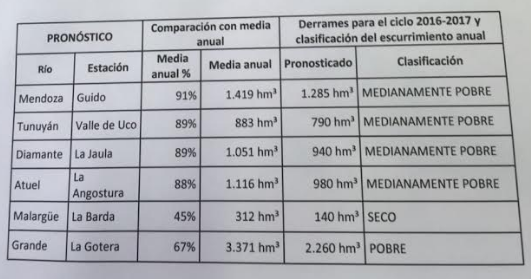El pronóstico indica que los ríos de Mendoza tendrán un año entre "medianamente pobre" y "seco". Hay ríos que acumulan 7 años con un caudal por debajo del promedio histórico, como es el caso del Río Atuel por ejemplo. Con respecto al conflicto con La Pampa, Álvarez señaló que los pampeanos "reclaman por un caudal de agua que saben que no existe".