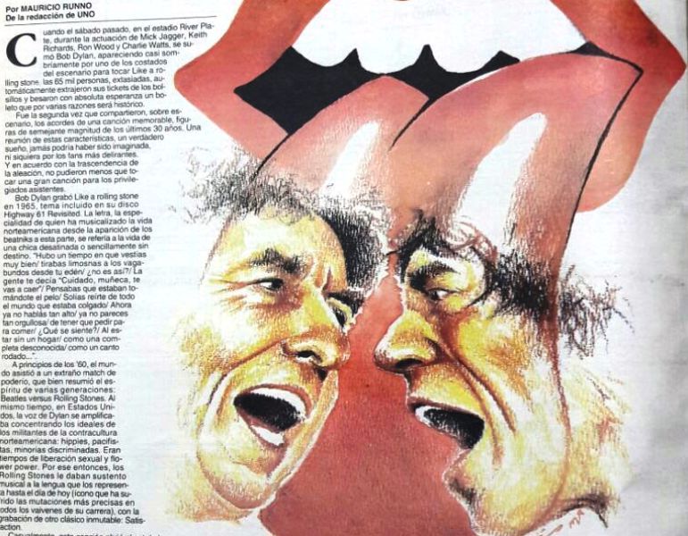 "Cuando el sábado pasado en el estadio de River durante la actuación de los Stones se sumó Bob Dylan, apareciendo casi sombríamente por uno de los costados del escenario para tocar "Like a Rolling Stones", las 65 mil personas extasiadas espontáneamente extrajeron su ticket de los bolsillos y besaron con absoluta esperanza un boleto que por varias razones será histórico".