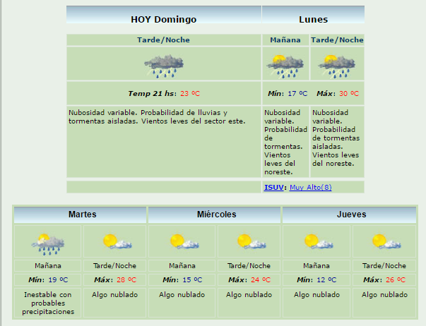 Pero, según el Servicio Meteorológico Nacional, el lunes se espera una máxima de 30º y una mínima de 17º C. Es decir, un por lado una jornada calurosa, y por otro, también lluvias.