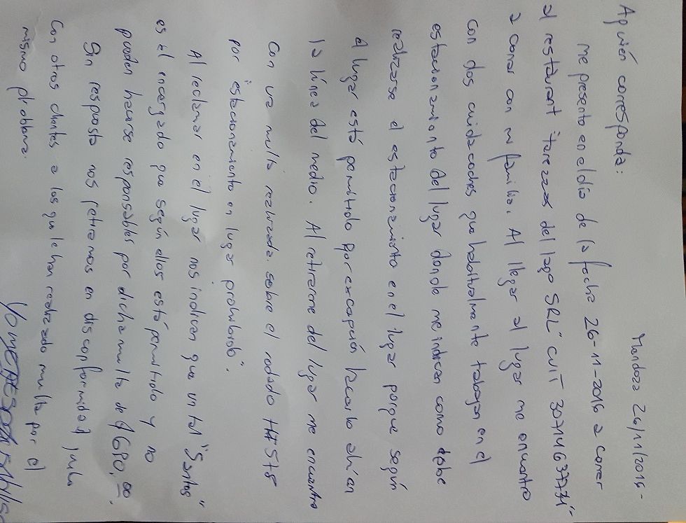 Sin embargo, "al retirarnos del lugar nos encontramos con una multa de $700 por estacionamiento en lugar indebido sobre doble línea amarilla, junto con otros clientes del lugar afectados por lo mismo".