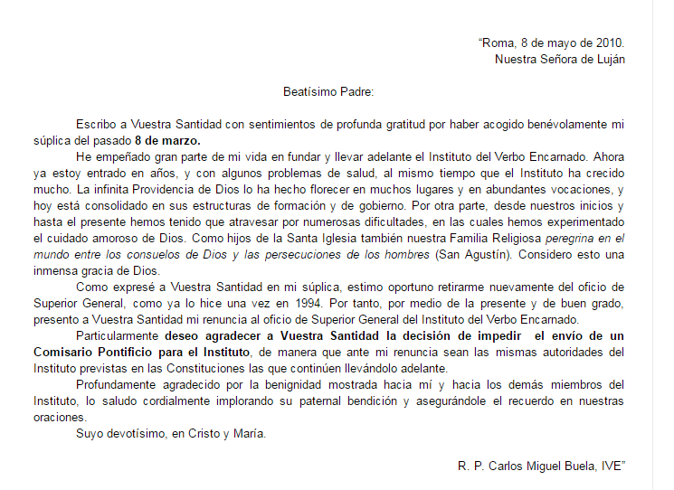 "El padre Carlos Miguel Buela, I.V.E., es sacerdote desde el 7 de octubre de 1971. Desde el comienzo de su sacerdocio se avocó con ahínco a la pastoral juvenil, con la convicción de que la Iglesia se ocupa de los jóvenes "no por táctica sino por vocación", se describe en la misma página, y ni en esta ni en la del instituto hay mención alguna de las decisiones tomadas por el Vaticano.