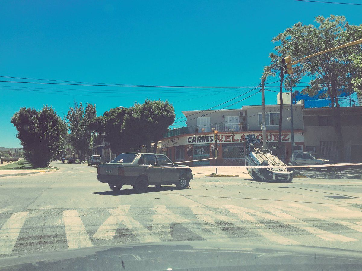 Un Fiat Duna y un vehículo utilitario se toparon a la altura de calle Antártida Argentina y el último terminó tumbado sobre su techo, casi sobre la vereda.