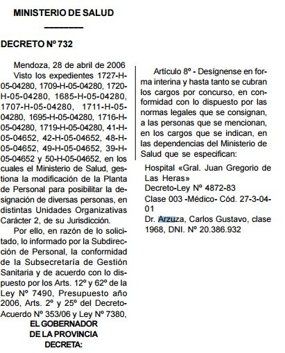 Pero la designación oficial se hizo poco tiempo después. Hasta abril del 2006 Arzuza tenía un contrato de locación como médico. Ese mes, el entonces gobernador Julio Cobos firmó varios decretos. En el decreto 732 le dan de baja al contrato de locación que tenía en el Hospital Las Heras. Pero en la misma norma lo nombran.