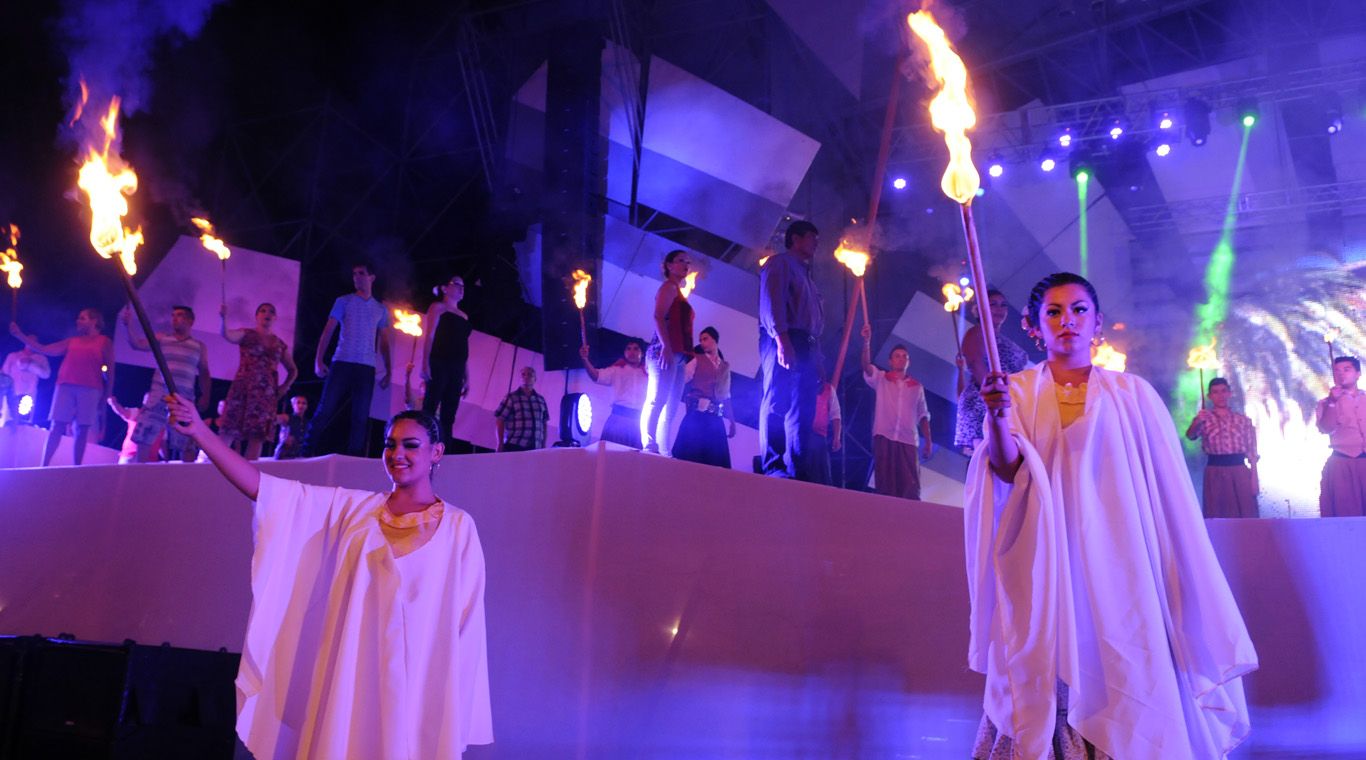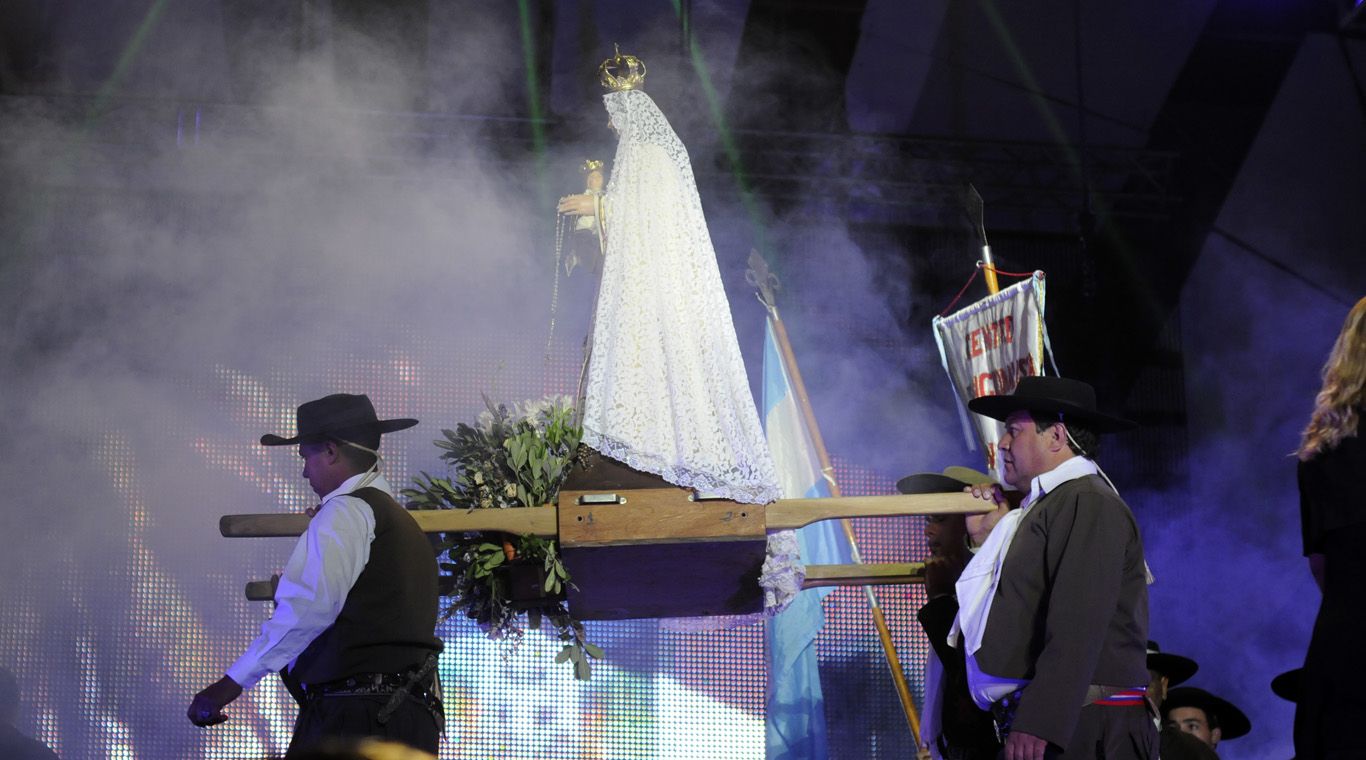 No faltó el homenaje a la Virgen de la Carrodilla, los bailarines ingresaron desde ambos costados del escenario elevando antorchas de fuego para hacer de ese uno de los momentos más emotivos de la noche.