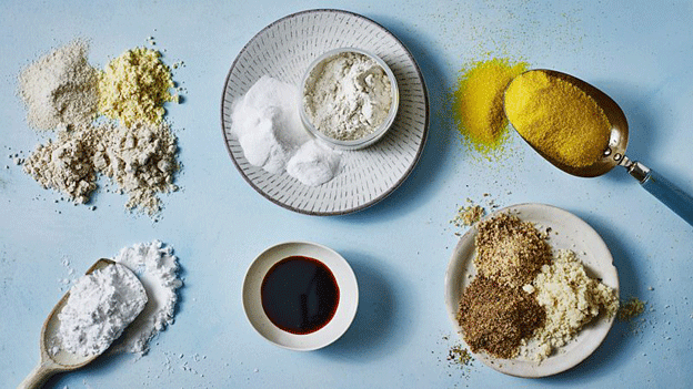 Las harinas de trigo y centeno suelen usarse como aglutinadores. A falta de ellas se puede utilizar para hornear goma guar o goma xantana (o ambas combinadas).