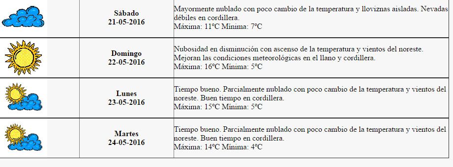 El pronóstico del Servicio Metereológico Nacional para alta montaña también indica cielo nublado y con lloviznas, con mínima de 0 grados y máxima de 8 grados para hoy, en tanto que para el domingo se espera una máxima de 9 grados y mínima de 2 grados bajo cero.
