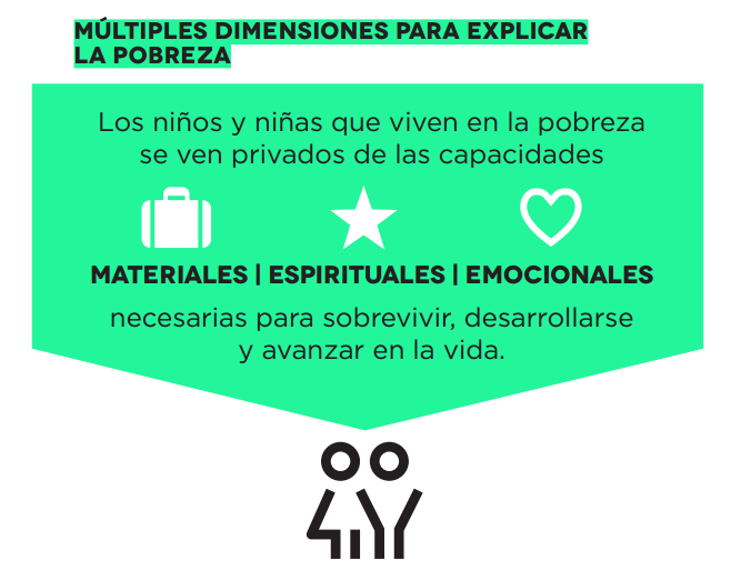 Esto les impide disfrutar de sus derechos, de alcanzar su pleno potencial o participar como miembros iguales en la sociedad.” (UNICEF, 2005). Esta conceptualización va más allá de la noción material tradicional de la pobreza y es intrínsecamente multidimensional (Ortiz et al., 2012).