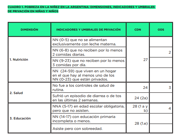 Con datos provenientes del relevamiento denominado Multiple Indicator Cluster Surveys (MICS) impulsado por UNICEF y realizado en la Argentina durante 2011/12 se pudieron calcular 28 indicadores de privación agrupados en 10 dimensiones (Cuadro 1), cada uno de ellos asociado al ejercicio de los derechos contemplados tanto en la Convención sobre los Derechos del Niño (CDN) como en los Objetivos de Desarrollo Sostenible (ODS).