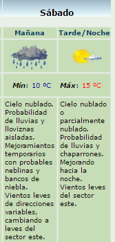 Para hoy se espera una mínima de 10º y una máxima de 15º, el cielo continuará nublado con probabilidad de lluvias y chaparrones.