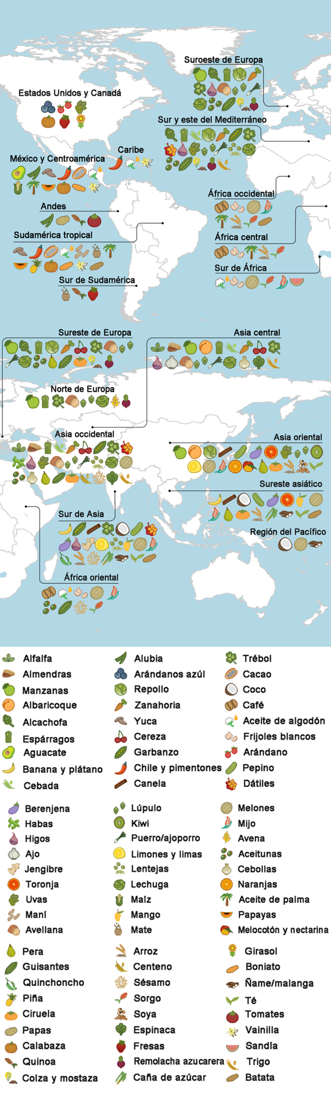 Este mapa muestra el origen de más de 150 cultivos clave para la alimentación de distintas regiones.
