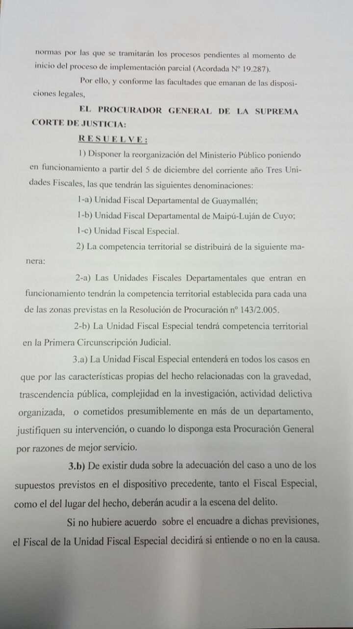 Desde el Ministerio Público Fiscal explicaron que existe una resolución de la Procuración -144/2005- que indica que "la Unidad Fiscal Especial entenderá en todos los casos en que, por las características del hecho, relacionadas con la gravedad, trascendencia pública, complejidad en la investigación, actividad delictiva organizada, o cometidos presumiblemente en más de un departamento, justifiquen su intervención, o cuando lo disponga esta Procuración General por razones de mejor servicio" (ver texto a la izquierda).