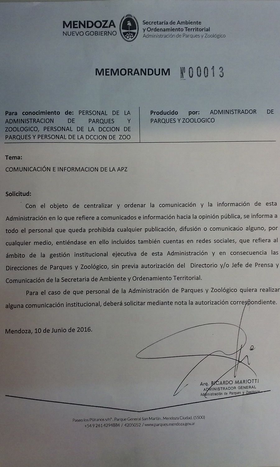 Trabajadores de la Administración de Parques y Zoológico hicieron llegar a MDZ un memorándum firmado por el titular de la cartera, Ricardo Mariotti, en el cual se informa que "queda prohibida cualquier publicación, difusión o comunicado alguno, por cualquier medio, [...] incluidos también las redes sociales, que refiera al ámbito de la gestión institucional ejecutiva de esta Administración y en consecuencia las Direcciones de Parques y Zoológico".