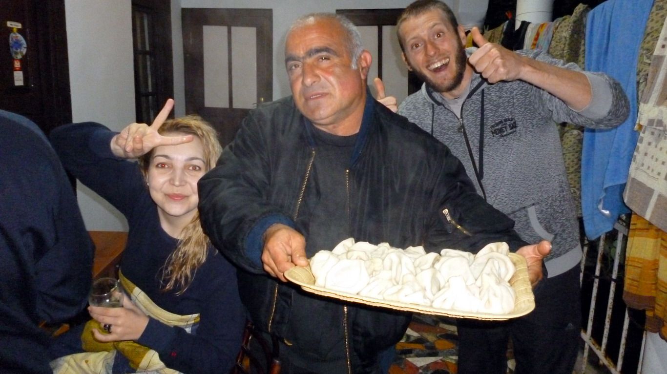 El lugar era maravilloso y empezamos a buscar dónde poner nuestra carpa para pasar la noche y preguntamos en una casa, la señora nos invita a pasar, nos sirve un té y “charlamos” (nuestro nivel de georgiano es extremadamente nulo, pero con voluntad, señas y sonrisas todo se puede) un rato, cuando le preguntamos si podíamos armar la carpa ahí nos respondió con un rotundo NO, que nos sorprendió, pero inmediatamente nos llevó arriba de su casa y nos mostró nuestra habitación, que durmiéramos ahí nos dijo. Felices empezamos a acomodarnos y comenzó a llegar gente, tíos, primos y hermanos que venían todos a cenar esa noche, y en el medio estábamos nosotros, tratando de entender un poco de qué pasaba, por suerte llegó una pareja joven que la chica hablaba algo de inglés y el muchacho es turco y nuestro nivel de turco es “un poco mejor” que de georgiano, así que gracias a ellos empezamos a entender un poco más, comimos muchísimo, aprendimos un juego de cartas, charlamos y tomamos mucho vino. Cualquier parecido con una reunión de amigos en Argentina es pura coincidencia.