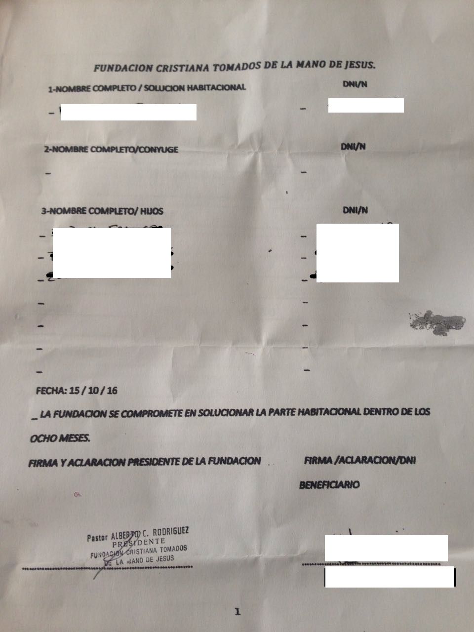 El pastor en cuestión es Alberto Rodríguez, según figura en la documentación a la que accedió MDZ. Quienes se anotaron sostienen que el mensaje que les dieron es que cuenta con unos terrenos que le donó el papa Francisco a su Iglesia, ubicados entre Palmares y los Caracoles, y que en ocho meses va a acabar con la crisis habitacional de quienes se inscriben. Para estar incluidos deben firmar una declaración jurada y aportar una copia de la partida de nacimiento, junto a la contribución monetaria exigida.