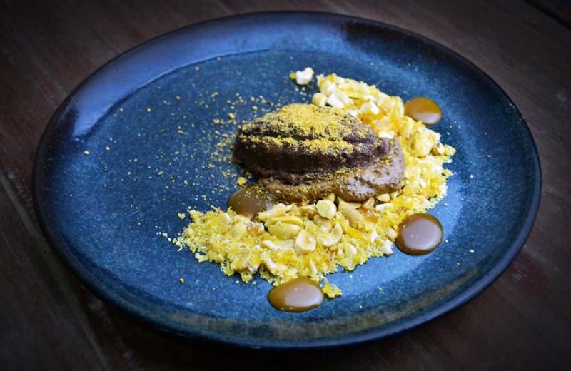 Húmedo de chocolate con helado de dulce de leche, maní, praliné y toffee de vinagre de plátano.
