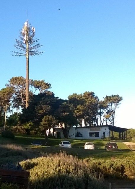 En esos días he reparado en esta antena, disfrazada, muy en vano en su intento por "adaptarse" al paisaje. Me he entretenido pensando que para el establecimiento es un ingreso financiero necesario (en voz baja siempre te hablan del que viene siempre y no paga la cuota desde que fundió la empresa y entró en depresión). También en la "necesidad" de que se vea lo menos posible.