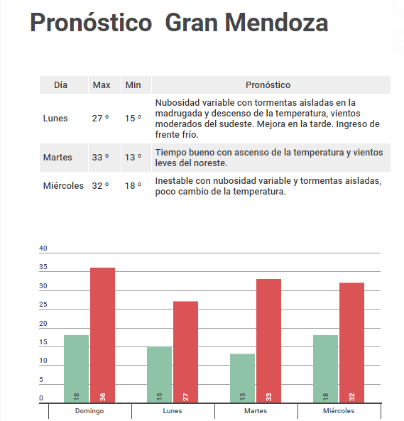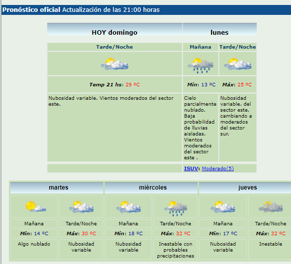 Máxima de 27 ºC y mínima de 15 ºC es el pronóstico para este lunes según Contingencias Climáticas (Ministerio de Economía, Infraestructura y Energía). Para esta madrugada se esperan tormentas aisladas, vientos moderados del sudeste y descenso de la temperatura.