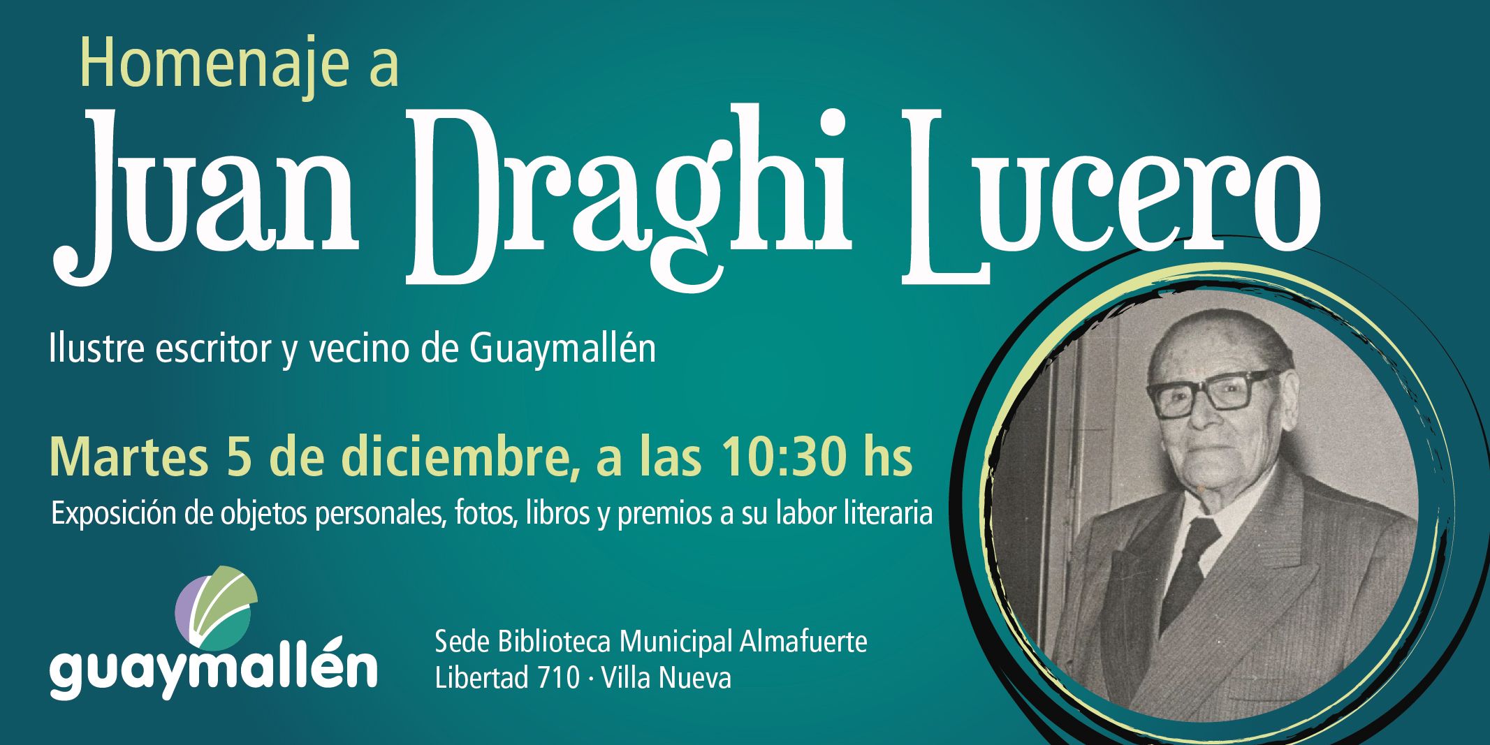 La Municipalidad de Guaymallén invita a la comunidad a participar de la inauguración de una vitrina de exposición que llevará el nombre de Juan Draghi Lucero, donde se exhibirán algunos objetos personales, libros y premios referidos a su importante labor literaria.