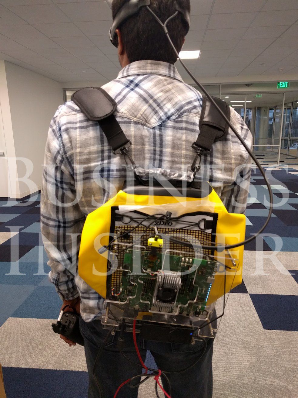 Un parte del dispositivo, que se compone de varias piezas, se coloca en la cabeza, en lo que parecen ser las gafas que reproducen la realidad aumentada. A través de un cable se conectan a una mochila que esconde la placa base y el procesador del aparato, entre otros componentes, que a su vez tiene enchufado otro dispositivo de hardware externo que se controla con la mano.