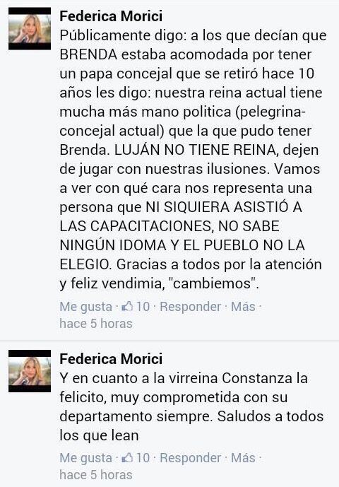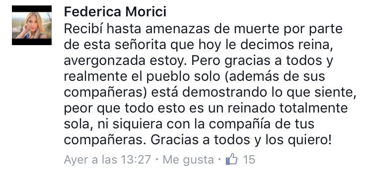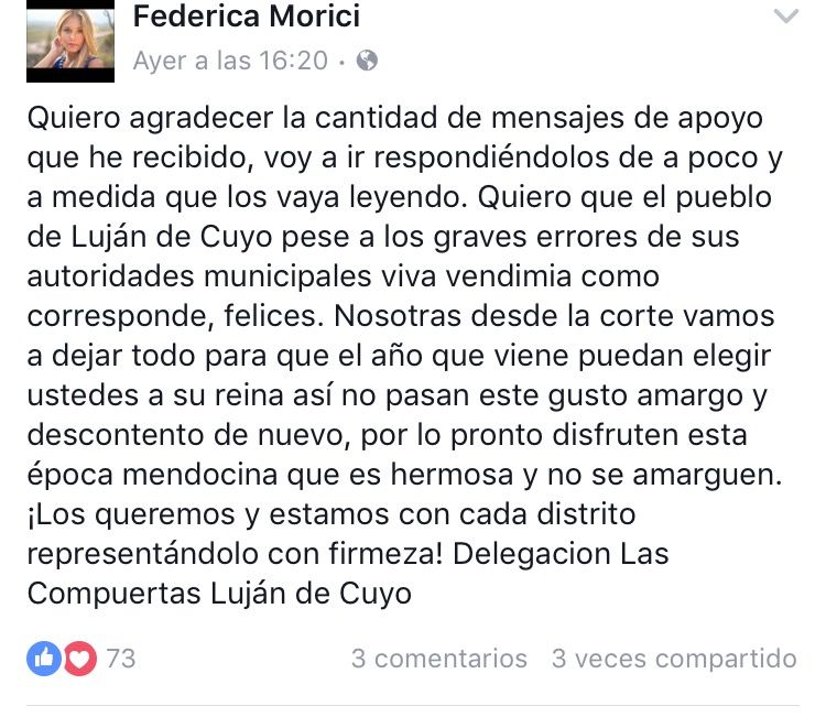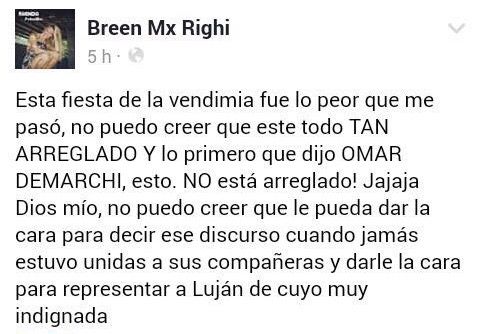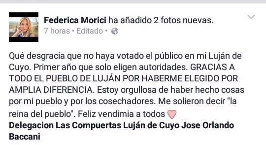 Una de las representantes que hizo catarsis a través de la red social Facebook fue la de Potrerillos, haciendo un duro posteo: