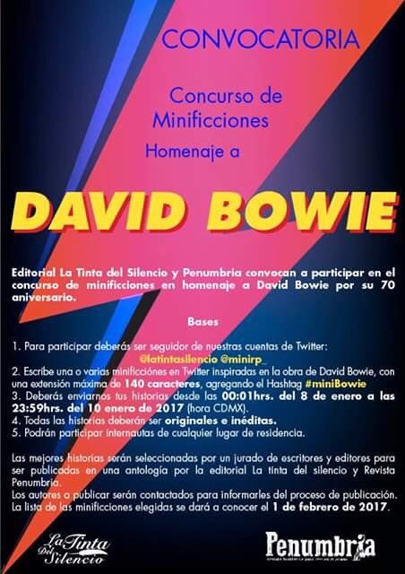 Se trataba de un concurso de minificciones, y me lo anunciaba un amigo que escribe las mejores. Le agradecí, y le dije que mandaría algo. Pero yo no estaba segura de eso. "A mí los concursos no me van, nunca me interesaron" Así estuve auto boicoteándome todo el día. Y la noche. Alguien me dijo que esa madrugada hablé dormida: "¡Pero se trata de Bowie, traidora!".