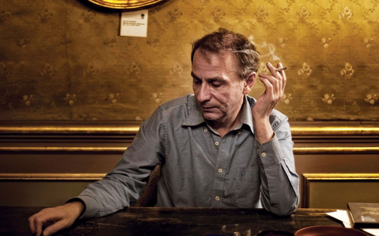 Anexo 1: Houellebecq bebe cerveza mientras lee una suerte de ensayo desmitificador, una lección para "progresistas que atrasan". No se percibe preocupado por situarse a la izquierda ni a la derecha de nadie ni de nada, sino de ejercitar una crítica. Es el punto seductor que siempre envuelve a sus libros de ficción (o no tanto): escribir sobre la realidad, pero la otra, la de carne y hueso, la falible, muy lejos de los círculos de poder, de lo dominante y hegemónico.