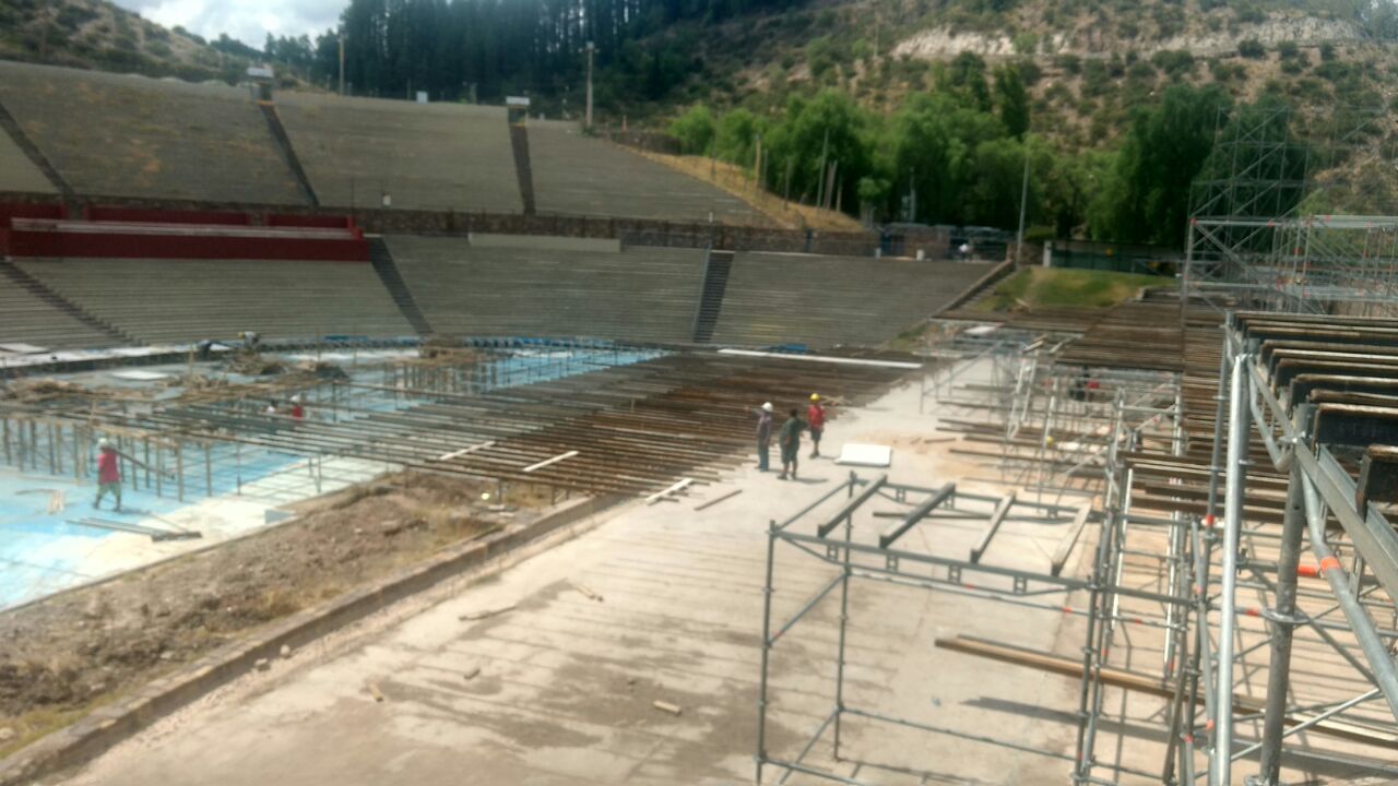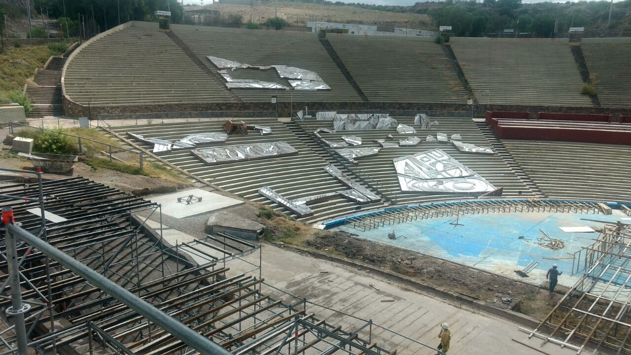Por estos días ya se levantaron las vigas que le dan estructura al escenario del Acto Central, junto con la construcción de las cajas lumínicas, que ya se encuentra en una fase bastante avanzada. Por su parte, hace un mes que se están llevando a cabo algunas intervenciones en el propio teatro griego, como la ampliación de algunos sectores y el asfaltado de varios ingresos.