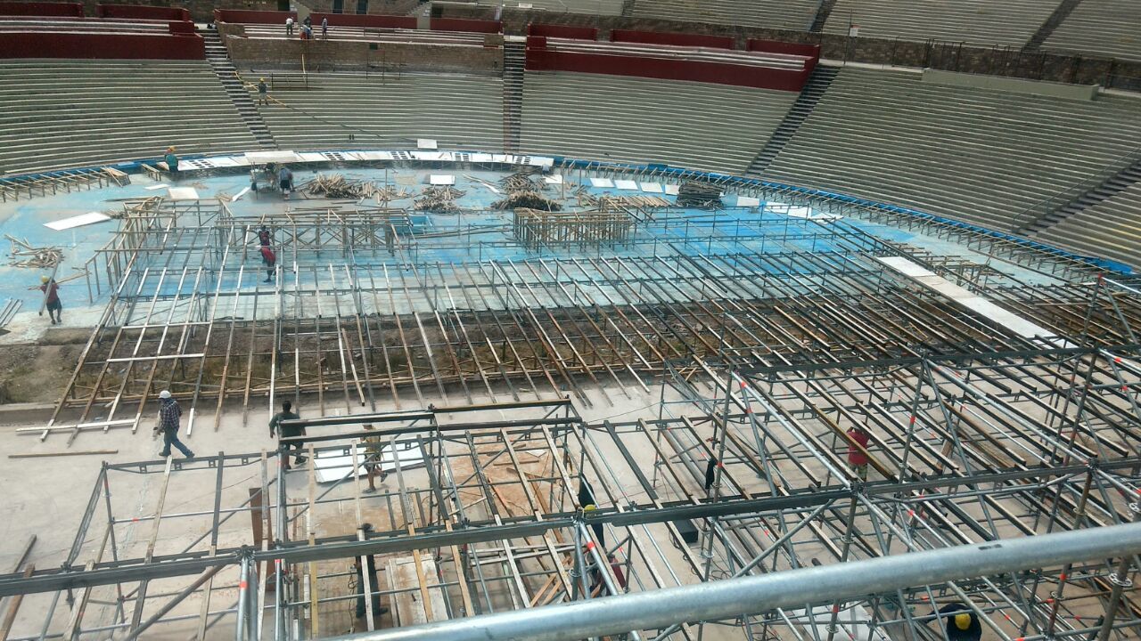 Respecto al montaje escenográfico, el funcionario manifestó que la estructura del escenario presenta un avance del 18%, mientras que la construcción de cajas lumínicas está al 90%. "Las obras avanzan a buen ritmo y el clima nos ayuda, por lo cual estamos sobrados", subrayó. En total se emplean a 90 personas, que se van rotando en grupos de entre 6 y 15 personas para estar en el teatro griego, mientras que las restantes hacen labores de taller.