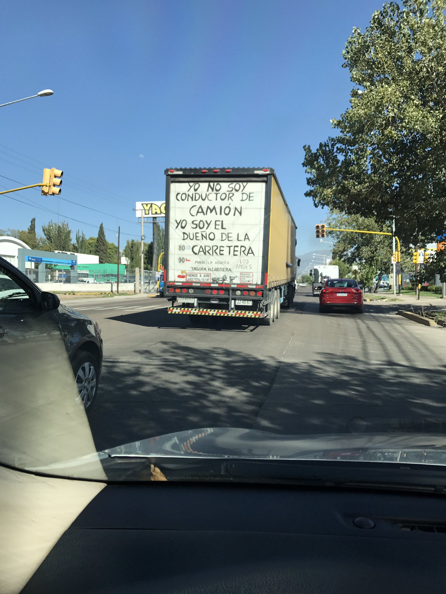Arturo Nicastro, lector de MDZ, mandó una fotografía que obtuvo al circular por la Cosnatera. Se trata de la imagen de un camión deorigen en la ciudad de Los Andes, Chile (según lo dice el mismo vehículo) que tiene una inmensa inscripción, provocación, bravuconada o broma, como se lo quiera interpretar: "Yo no soy conductor de camión, yo soy el duelo de la carretera" dice y lo firma: Marcela Agüero y Fabián H. Cabrera. ¿Lo habrán escrito los propietarios, orondos ellos? ¿O será una venganza de algún extraño en un momento de distracción? Lo cierto es que no pasó desapercibido.