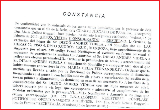 Fernández indicó que "Videla nunca respetó el convenio firmado" y que, por el contrario, se "llevaba a los niños impidiendo el contacto" con la madre, además no cumplió con el pago del alquiler de la vivienda por lo que ella y sus hijos fueron desalojados. Desde el 8 de agosto y hasta el 9 de septiembre de 2011 el hombre se llevó a los niños y no dejó que la mujer los viera, hasta que la Justicia le ordenó lo contrario.