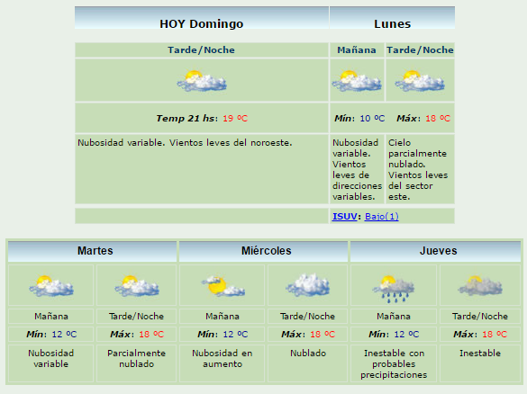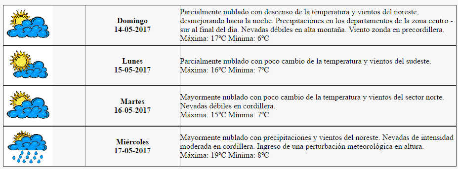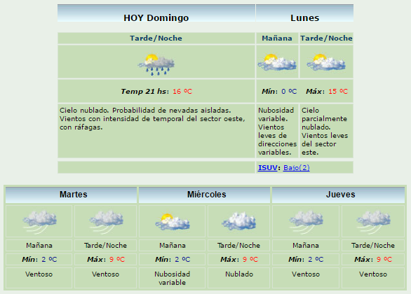 En cambio el pronóstico local de Contingencias Climáticas también prevé mínimas de 7 grados y máxima de 16 grados. En este caso, a diferencia del SMN, se trata de temperaturas un poco más bajas. Y en el pronóstico extendido aparecen lluvias para el día miércoles.