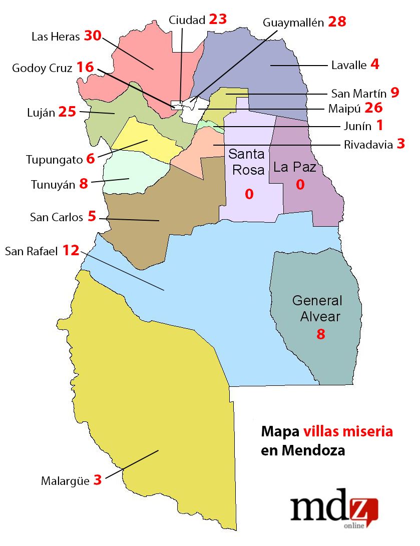 En cuanto a los números provinciales por departamento, es en la zona del Gran Mendoza donde más concentración de asentamientos se observa. Las Heras es el departamento que más villas miseria registra con 30; seguida por Guaymallén con 28 y Maipú con 26; mientras que Luján con 25 y Capital con 23 completan el top 5.