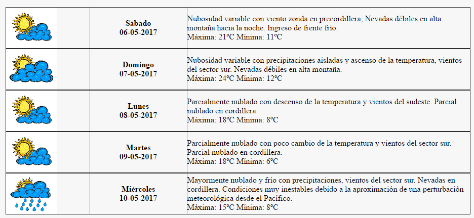 El Servicio Meteorológico Nacional (SMN) informó que para este domingo a la mañana se esperan neblinas y bancos de niebla, junto con nubosidad variable y paulatino desmejoramiento de las condiciones meteorológicas con probabilidad de lluvias aisladas hacia el mediodía, y la mínima estaría en torno a los 13 grados.