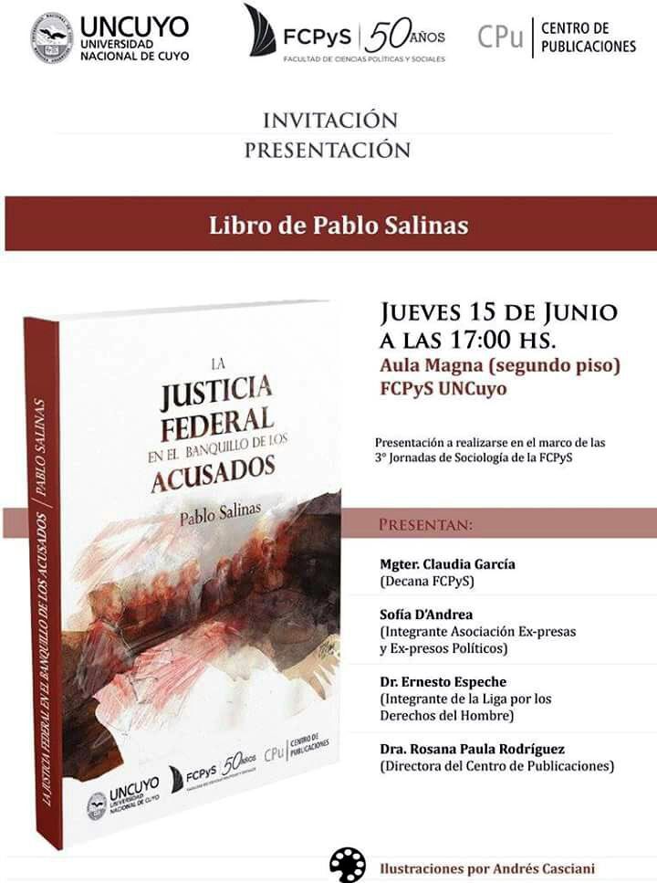 El Movimiento Ecuménico por los Derechos Humanos - Regional Mendoza, invita a la presentación del libro "La Justicia Federal en el Banquillo de los Acusados", del Dr. Pablo Salinas, a realizarse el jueves 15 de junio a las 17hs. en el Aula Magna de la Facultad de Ciencias Políticas y Sociales de la UNCuyo.