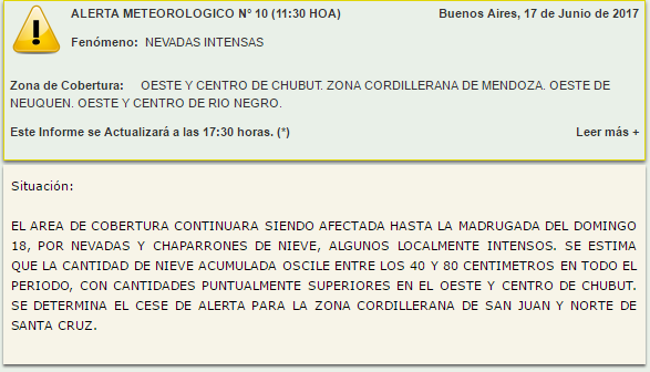 En la tarde de este sábado rige un alerta de nevadas intensas en la zona cordillerana de Mendoza. Este es el comunicado emitido por el Servicio Metereológico Nacional: