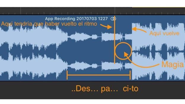 García se refiere al minuto 1:23 de la canción, en el que la melodía se detiene y por primera vez Fonsi dice "Des pa ci to". Ahí, aunque casi imperceptible, el fraseo de Fonsi se desencaja del tempo, se retrasa respecto a la métrica que lleva el ritmo.