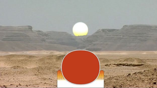 El lugar está rodeado de lomas y en ciertos momentos del año el Sol sale entre una grieta creando la forma del jeroglífico del horizonte. Arriba, la grieta entre las lomas y el Sol saliente. Abajo, el jeroglífico del horizonte, con el Sol en medio.